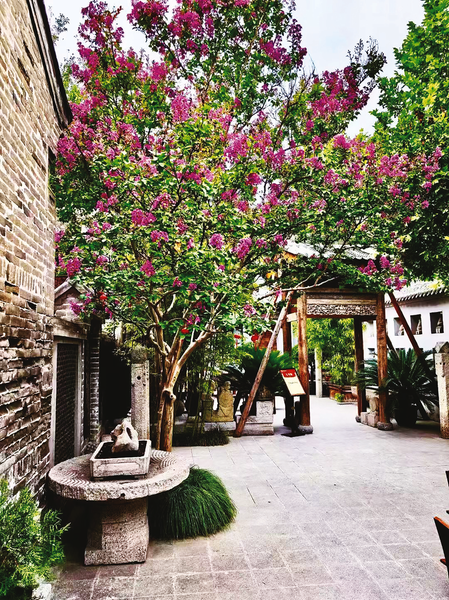记得是八月的一个清晨,我慕名来到了状元府。偌大的庭院浓荫蔽日,有青翠欲滴的翠竹,有挂满果实的石榴,有高耸过屋脊的海棠树,它们在庭院深处疏落有致、奋力生长。中庭的墙隅处一棵高大的古树分外惹眼,盘曲如虬龙的枝干欲与高墙比肩,枝桠上挂满了一串串紫薇花,细密花瓣如绉纱层叠,沉甸甸的花朵压弯枝头。这粉云映衬下的古邸,更添一份穿越时空的清幽雅致。