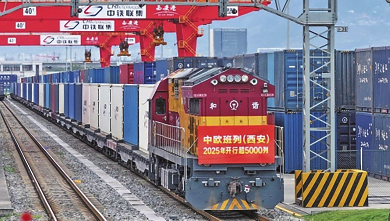 国铁集团提供的数据显示,2025年1-10月份,中欧班列(西安)累计开行5063列,同比增长16.3%,创历年同期最高纪录。开行量、货运量、重箱率等核心指标持续稳居全国前列。图为X9043次中欧班列(西安)驶出西安国际港站。新华社记者 邵瑞 摄