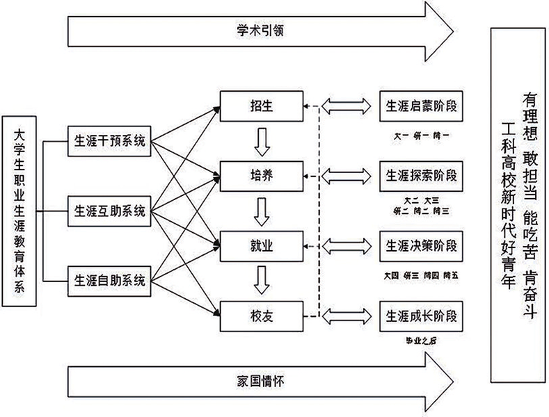习近平总书记在党的二十大报告中提出,教育、科技、人才是全面建设社会主义现代化国家的基础性、战略性支撑,强调青年强,则国家强;并对广大青年提出了立志做有理想、敢担当、能吃苦、肯奋斗的新时代好青年的希冀。为此,一些高校开展新时代工科学生全链条生涯辅导体系研究并进行实践探索,积极响应总书记的号召,努力推动人才培养体系建设。